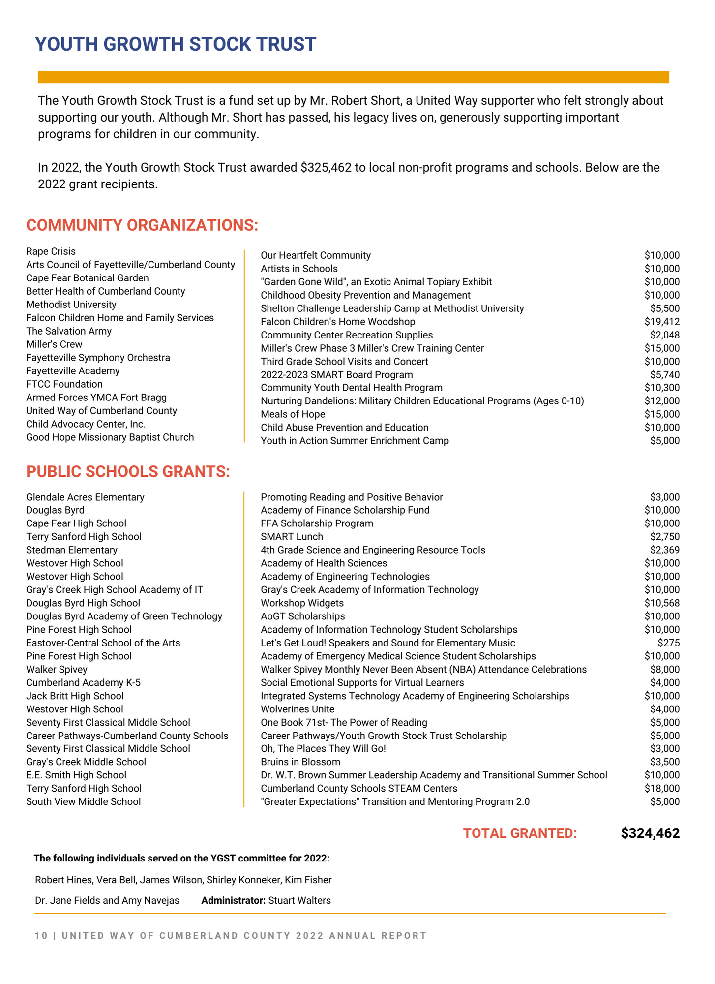 The Youth Growth Stock Grant was established in 1992, due to the late Robert Short’s concern for the well-being of the community’s youth. United Way of Cumberland County is the trust administrator. Each year, grants are awarded to local programs, initiatives, schools and scholarships that specifically benefit Cumberland County youth